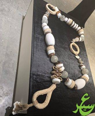 وتم استخدام مادة النانو لطلي الخرز ،وهي مادة تتسم بخصائص لونية ببياض فائق غير قابل للتغير اللوني وهي خصائص مادية رمزية تعبر عن المجتمع السعودي الذي حافظ على عاداته وتقاليده دون تغييرها او الاستغناء عنها .