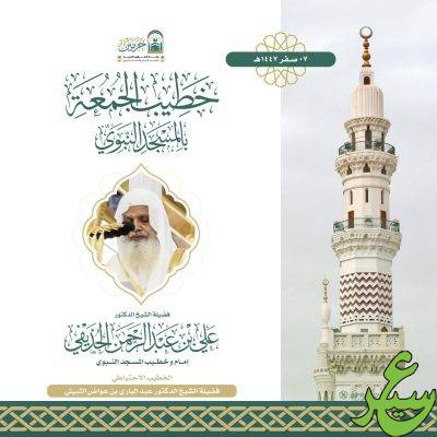 فيما يخطب ويؤم المصلين في المسجد النبوي فضيلة الشيخ الدكتور ⁧‫علي الحذيفي
