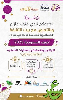 يستعد نادي فنون جازان، التابع لجمعية أندية الهواة “هاوي”، لإطلاق معرض فني تشكيلي رقمي مبتكر بعنوان “صيف السعودية 2025” يوم غداً الثلاثاء ، الموافق 19 أغسطس 2025. يأتي هذا المعرض الطموح بالتعاون مع بيت الثقافة ومجموعة من الشركاء من القطاعين الخاص وغير الربحي، بهدف دعم وتعزيز المشهد الفني في المنطقة وإبراز أعمال الفنانين السعوديين والمقيمين.