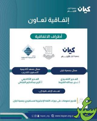 وتأتي هذه الاتفاقية في سياق تعزيز المسؤولية المجتمعية، حيث سيقدّم معهد أكسفورد خصومات مميزة على دوراته في اللغة الإنجليزية لمستفيدي جمعية كيان، مما يسهم في رفع كفاءتهم اللغوية، ويؤهلهم لفرص تعليمية ووظيفية أوسع.