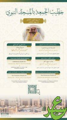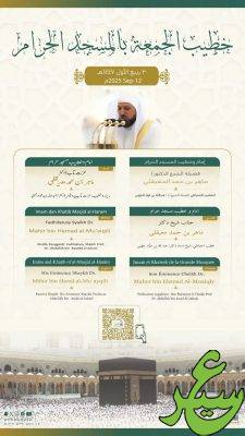 أعلنت رئاسة الشؤون الدينية بالمسجد الحرام والمسجد النبوي، عن أسماء خطيبي وأئمة صلاة الجمعة في الحرمين الشريفين ليوم الجمعة الموافق 20 ربيع الأول 1447هـ وذلك ضمن جدولها الدوري لتنظيم الإمامة والخطابة.
