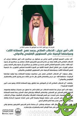 أكد صاحب السمو الملكي الأمير تركي بن هذلول بن عبدالعزيز نائب أمير منطقة نجران، أن الخطاب الملكي الذي ألقاه نيابة عن خادم الحرمين الشريفين الملك سلمان بن عبدالعزيز آل سعود -أيده الله-، صاحب السمو الملكي الأمير محمد بن سلمان بن عبدالعزيز آل سعود ولي العهد رئيس مجلس الوزراء، في افتتاح أعمال السنة الثانية من الدورة التاسعة لمجلس الشورى، جاء تجسيدًا لنهج المملكة الثابت وسياستها الرصينة على المستويين الإقليمي والدولي.