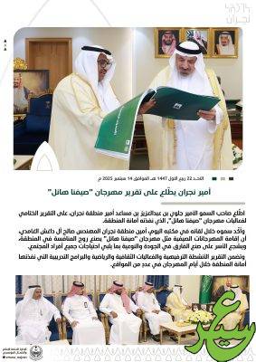 اطّلع صاحب السمو الأمير جلوي بن عبدالعزيز بن مساعد أمير منطقة نجران، على التقرير الختامي لفعاليات مهرجان “صيفنا هائل”, الذي نفذته أمانة المنطقة.