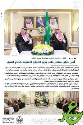 واستعرض سموه -خلال الاستقبال- برامج الوزارة في قطاع العمل، ومبادراتها الهادفة إلى تطوير سوق العمل، وجهودها في تمكين الكفاءات الوطنية، ورفع نسب التوطين، بما يتماشى مع مستهدفات رؤية المملكة 2030.