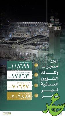 أعلنت رئاسة الشؤون الدينية بالمسجد الحرام والمسجد النبوي ممثلة في وكالة الشؤون النسائية عن أبرز منجزاتها خلال شهر صفر، حيث قدّمت (118,699) خدمة توجيه وإرشاد ديني لقاصدات بيت الله الحرام، شملت برامج تثقيفية وتوعوية والإجابة عن استفسارات متنوعة.