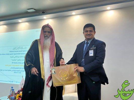 وفي ختام الكلمة تم تكريم فضيلة الشيخ محمد بن شامي شيبه من قبل عميد الكلية على جهوده المبذولة في غرس قيم التماسك لدى جيل المستقبل الذي يسهم في استقرار الوطن وحفظ أمنه كما تم تقديم إهداء قيّم من مطبوعات الرئاسة العامة للبحوث العلمية والإفتاء لسعادة عميد الكلية.
