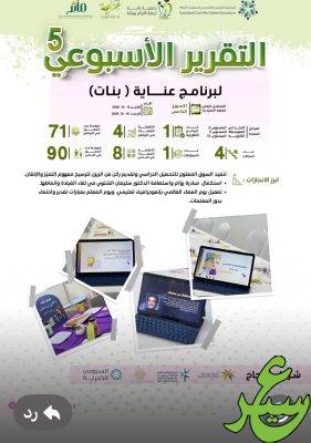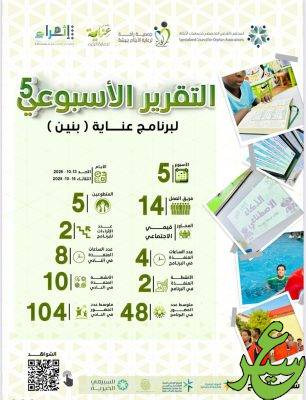نشرت جمعية رأفة لرعاية الأيتام بمحافظة بيشة تقريرها الخامس المتعلق ببرنامجي عناية وقناديل بنين وبنات، مُستعرضة أبرز مُنجزات الأسبوع.