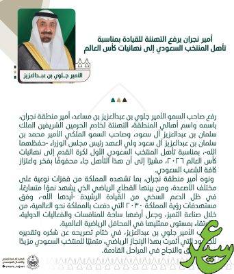 رفع صاحب السمو الأمير جلوي بن عبدالعزيز بن مساعد، أمير منطقة نجران، باسمه واسم أهالي المنطقة، التهنئة لخادم الحرمين الشريفين الملك سلمان بن عبدالعزيز آل سعود، وصاحب السمو الملكي الأمير محمد بن سلمان بن عبدالعزيز آل سعود ولي العهد رئيس مجلس الوزراء -حفظهما الله-، بمناسبة تأهل المنتخب السعودي الأول لكرة القدم إلى نهائيات كأس العالم 2026، مشيرًا إلى أن هذا التأهل جاء محفوفًا بفخر واعتزاز كافة الشعب السعودي.