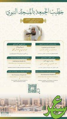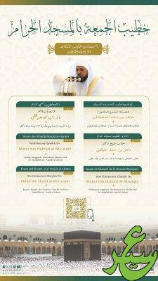 أعلنت رئاسة الشؤون الدينية بالمسجد الحرام والمسجد النبوي، عن أسماء خطيبي وأئمة صلاة الجمعة في الحرمين الشريفين 9 جماد الاولى1447هـ وذلك ضمن جدولها الدوري لتنظيم الإمامة والخطابة.