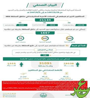 أسفرت الحملات الميدانية المشتركة لمتابعة وضبط مخالفي أنظمة الإقامة والعمل وأمن الحدود، التي تمت في مناطق المملكة كافة، وذلك للفترة من 29/ 05/ 1447هـ الموافق 20/ 11/ 2025م إلى 05/ 06/ 1447هـ الموافق 26/ 11/ 2025م، عن النتائج التالية: