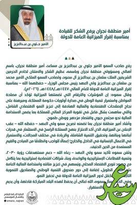رفع صاحب السمو الأمير جلوي بن عبدالعزيز بن مساعد، أمير منطقة نجران، باسم أهالي ومسؤولي منطقة نجران وباسمه، عظيمَ الشكر والامتنان لخادم الحرمين الشريفين الملك سلمان بن عبدالعزيز آل سعود، ولصاحب السمو الملكي الأمير محمد بن سلمان بن عبدالعزيز ولي العهد رئيس مجلس الوزراء – حفظهما الله – بمناسبة إقرار الميزانية العامة للدولة للعام المالي 1447هـ/1448هـ (2026م).