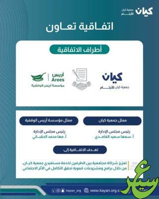 توقيع اتفاقية تعاون بين جمعية كيان للأيتام ومؤسسة أريس الوقفية