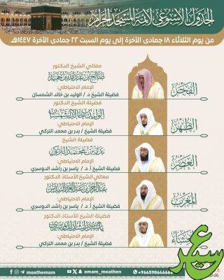 ويأتي اعتماد هذا الجدول في إطار تنظيم شؤون الإمامة بالمسجد الحرام والمسجد النبوي، بما يتيح للمصلين أداء عباداتهم في أجواء روحانية مفعمة بالطمأنينة، وبقيادة أئمةٍ من أهل العلم والخبرة.
