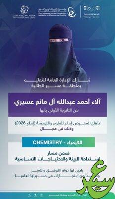تأهلت الإدارة العامة للتعليم في منطقة عسير ممثلة في الطالبة آلاء أحمد آل مانع عسيري من الثانوية الأولى بأبها للمشاركة في معرض إبداع للعلوم والهندسة (إبداع 2026)، وذلك في مجال الكيمياء ضمن مسار استدامة البيئة والاحتياجات الأساسية.