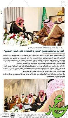 أكّد صاحب السمو الأمير جلوي بن عبدالعزيز بن مساعد أمير منطقة نجران، أهمية العمل على الجانب الوقائي والتوعوي الذي يضمن تعزيز حصانة المجتمع تجاه آفة المخدرات، بما ينعكس على صلاحهم ووقايتهم، والوصول إلى مجتمعٍ آمن وصحي وحيوي، مشددًا على أهمية تعزيز المشاركات والمبادرات التطوعية لأفراد المجتمع المدني ومؤسساته للمساهمة في الحد من انتشارها.