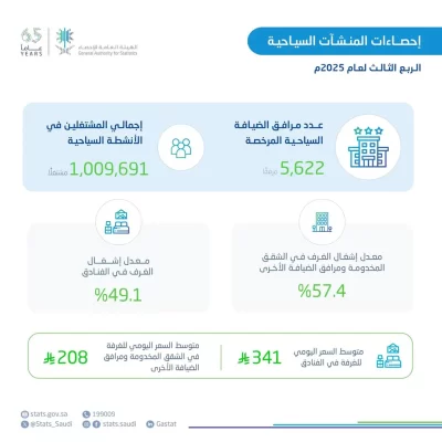 أعلنت الهيئة العامة للإحصاء اليوم، نتائج إحصاءات المنشآت السياحية للربع الثالث 2025، ووفقًا لنتائج النشرة فقد بلغ معدل إشغال الغرف في الفنادق 49.1% خلال الربع الثالث من عام 2025م، مسجّلًا ارتفاعًا بمقدار 2.9 نقطة مئوية مقارنةً بالربع المماثل من عام 2024م الذي بلغ فيه معدل الإشغال 46.1%، كما بلغ معدل إشغال الغرف في الشقق المخدومة ومرافق الضيافة الأخرى 57.4% خلال الربع الثالث من عام 2025م، مقابل 58% في الفترة ذاتها من عام 2024م، مسجلًا انخفاضًا قدره 50. نقطة مئوية.