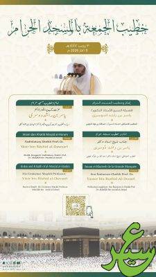 وسيتولى فضيلة الشيخ الأستاذ الدكتور ياسر الدوسري إمامة المصلين وإلقاء خطبة الجمعة في المسجد الحرام.