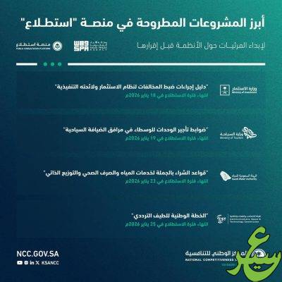 كما طرحت وزارة السياحة عبر المنصة مشروع (ضوابط تأجير الوحدات للوسطاء في مرافق الضيافة السياحية)؛ بهدف تنظيم هذه الممارسة وتحقيق الكفاءة التشغيلية، وتعزيز موثوقية السوق بما يراعي مصالح جميع الأطراف ذات العلاقة، وينتهي الاستطلاع على المشروع بتاريخ 19 يناير 2026م.