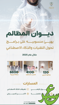 نفّذ ديوان المظالم خلال عام 2025م حزمة من البرامج التدريبية التطويرية المتخصصة في مجالات تحول التقنيات والذكاء الاصطناعي، ضمن (134) برنامجًا تدريبيًا استهدفت منسوبيه من الكوادر القضائية والإدارية، بإجمالي (6648) ساعة تدريبية، استفاد منها (4139) متدربًا في مختلف محاكمه وإداراته بمناطق المملكة.