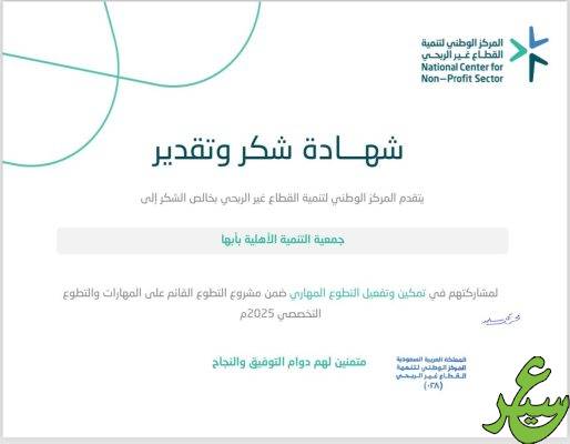 حصلت جمعية التنمية الأهلية بأبها على شهادة شكر من المركز الوطني لتنمية القطاع غير الربحي، تقديرًا لمشاركتها الفاعلة في تمكين وتفعيل التطوع المهاري ضمن مشروع التطوع القائم على المهارات والتطوع التخصصي لعام 2025.