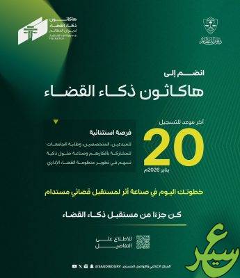 تنتهي الثلاثاء المقبل 20 يناير 2026، فترة التسجيل في هاكاثون *ذكاء القضاء* الذي ينظمه ديوان المظالم لاستقطاب الأفكار الابتكارية في الاستفادة من تحول التقنيات والذكاء الاصطناعي لتطوير وتجويد أعماله وتحسين تجارب المستخدمين على اختلاف فئاتهم، حيث انطلقت فترة التسجيل في الهاكاثون الأول من نوعه في الأعمال القضائية في العالم يوم 28 ديسمبر الماضي.