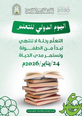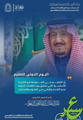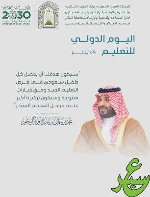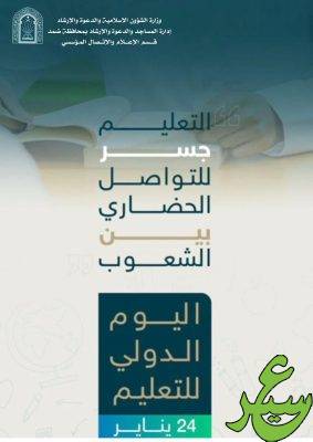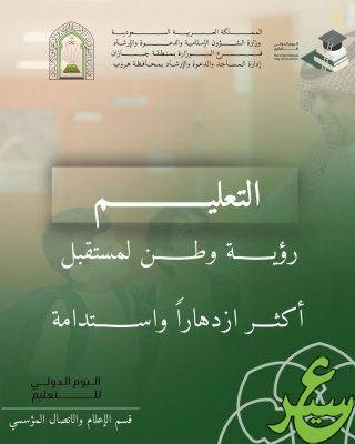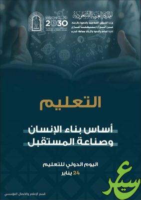 تشارك وزارةُ الشؤون الإسلامية والدعوة والإرشاد، ممثّلةً بفرعها في منطقة جازان، المجتمع في اليوم العالمي للتعليم لعام 2026م، وذلك يوم السبت الخامس من شهر شعبان لعام 1447هـ، الموافق الرابع والعشرين من شهر يناير من كل عام ميلادي، من خلال تنفيذ مشاركة توعوية رقمية تستمر لمدة خمسة أيام.