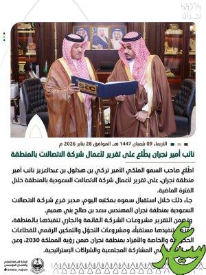 اطّلع صاحب السمو الملكي الأمير تركي بن هذلول بن عبدالعزيز نائب أمير منطقة نجران، على تقرير لأعمال شركة الاتصالات السعودية بالمنطقة خلال الفترة الماضية.