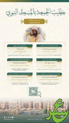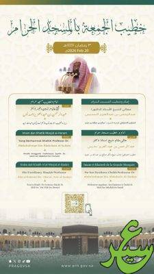 أوضحت رئاسة الشؤون الدينية بالمسجد الحرام والمسجد النبوي، عن أسماء خطيبا وإماما صلاة الجمعة في الحرمين الشريفين 3 رمضان 1447هـ وذلك ضمن جدولها الدوري لتنظيم الإمامة والخطابة.