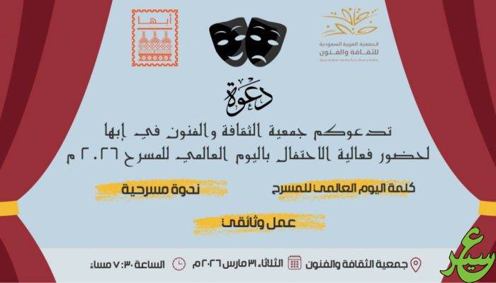 تنظّم جمعية الثقافة والفنون في أبها مساء يوم الثلاثاء فعالية خاصة بمناسبة اليوم العالمي للمسرح، ضمن جهودها المتواصلة لتعزيز الحراك الثقافي والفني في المنطقة، ودعم الفنون الأدائية بوصفها أحد روافد الإبداع والتعبير المجتمعي.