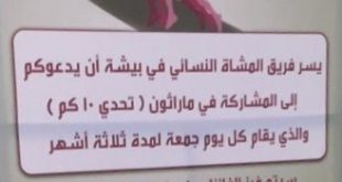 صحيفة عسير – خلود عبدالله : اطلق فريق مشاة بيشة النسائي بمحافظة بيشة عصر اليوم الجمعة 10/6/1440هـ الموافق15 من شهر فبراير بحديقة الملك عبدالله في ماراثون المشي تحدي 10 كيلو ، حيث شاركن نساء بيشة في هذا الماراثون مايقارب 40 مشاركة وقد شهد الممشى اقبالا كبيرا من الحاضرات للتعرف على فكرة الماراثون وفوائده وكيفية المشاركة به . وأوضحت قائدة الفريق …