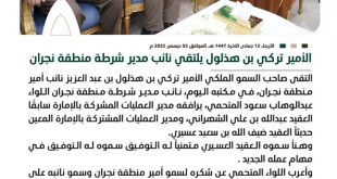 صحيفة عسير ـ يحيى مشافي التقى صاحب السمو الملكي الأمير تركي بن هذلول بن عبدالعزيز نائب أمير منطقة نجران، في مكتبه اليوم، نائب مدير شرطة منطقة نجران اللواء عبدالوهاب سعود المتحمي، يرافقه مدير العمليات المشتركة بالإمارة سابقًا العقيد عبدالله بن علي الشهراني، ومدير العمليات المشتركة بالإمارة المعين حديثًا العقيد ضيف الله بن سعيد عسيري. وهنأ سموه العقيد العسيري, متمنيًا له …