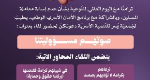 صحيفة عسير ـ جميل القثامي – مكة المكرمة ضمن الأنشطة والبرامج والفعاليات التي تقوم بها جمعية يسر للتنمية الأسريّة بمكة المكرمة وتزامنًا مع اليوم العالمي للتّوعية بشأن عدم إساءة معاملة المسنين، وبالشراكة مع برنامج الأمان الأسري الوطني تقيم الجمعية لقاء : بعنوان (صوتهم مسؤوليتنا) أوضحت ذلك الأستاذة الدكتورة هيفاء عثمان فدا – رئيسة مجلس إدارة الجمعية واشارت بأن اللقاء يتضمن …