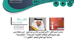 صحيفة عسير – حنيف آل ثعيل : في تفاعل نبيل لسمو أمير منطقة عسير الأمير فيصل بن خالد بن عبدالعزيز اعتمد سموه نموذج تهنئة لمعلمي ومعلمات إدارة تعليم بيشة في جميع محافظاتها ومراكزها بمناسبة اليوم العالمي للمعلم الذي يوافق يوم غد الجمعة 5 اكتوبر 2018 . و قدم سموه تهنئة للمعلمين و المعلمات عبر رسالة حملت تقدير أمير عسير لـ …