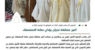 صحيفة عسير ـ يحيى مشافي أدَّى صاحب السمو الأمير جلوي بن عبدالعزيز بن مساعد أمير منطقة نجران صلاة الاستسقاء مع جموع المصلين في مسجد إمارة المنطقة. وأمَّ المصلّين مدير فرع وزارة الشؤون الإسلامية والدعوة والإرشاد بالمنطقة مشعل بن سالم العتيبي، الذي بيّن أهمية صلاة الاستسقاء في اتباع هدي المصطفى -صلى الله عليه وسلم- عند الجدب وتأخر نزول المطر، وفي …