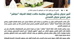 صحيفة عسير ـ يحيى مشافي دشَّن صاحب السمو الأمير جلوي بن عبدالعزيز بن مساعد أمير منطقة نجران، في مكتبه بالإمارة اليوم، برنامج متابعة حالات إنقاذ الحياة “مباشر”، بحضور الرئيس التنفيذي بتجمع نجران الصحي خالد بن عايض عسيري، وعددٍ من منسوبي التجمع. ويعد برنامج متابعة حالات إنقاذ الحياة “مباشر”، عبارة عن لوحة تحكم في المستشفيات والمراكز يتم من خلالها طلب …