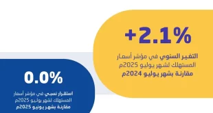صحيفة عسير ـ واس كشفت الهيئة العامة للإحصاء، أن معدل التضخم السنوي في المملكة سجل استقرارًا نسبيًا بلغ 2.1% خلال شهر يوليو 2025م، مقارنة بنظيره من العام الماضي، كما استقر مؤشر أسعار المستهلك في شهر يوليو 2025م، مقارنةً بشهر يونيو 2025م، وذلك على أساس شهري، حيث لم تسجل أسعار معظم الأقسام أي تغيير نسبي يُذكر. وفي ذات السياق استقر مؤشر …