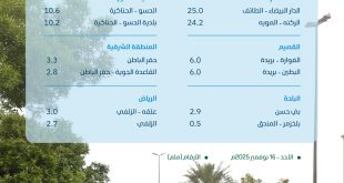 صحيفة عسير ـ يحيى مشافي سجلت منطقة مكة المكرمة أعلى معدل لكميات الأمطار بـ 32,2 ملم، في سبت الجارة بمحافظة القنفذة، ضمن 7 مناطق بالمملكة، شهدت هطول كميات متفرقة من الأمطار، فيما سجلت الدار البيضاء بالطائف 25.0 ملم، والركنه بالمويه 24,2 ملم، والهدا بالطائف 16,4 ملم. ووفقًا للتقرير اليومي لوزارة البيئة والمياه والزراعة حول كميات هطول الأمطار في مناطق المملكة …