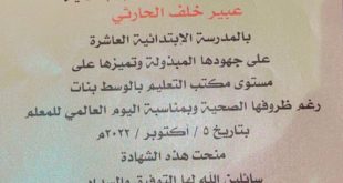 صحيفة عسير – سعيدة آل ناصر : كرّمت إدارة التعليم بمحافظة بيشة ممثلةً بمدير التعليم الأستاذ/ سفر محمد بريدي ،ومدير الإعلام والإتصال الأستاذ/ فهيد عون الدوسري ، المنسقة الإعلامية بالمدرسة الابتدائية العاشرة الأستاذة / عبير خلف الحارثي ، بمناسبة اليوم العالمي للمعلم ، وذلك نظير جهودها المبذولة وتميزها على مستوى التعليم بمكتب الوسط ( بنات) ، رغم ظروفها الصحية ، …