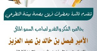 صحيفة عسير – نوال حمد : رفعت قائدة فريق بصمة بيشة التطوعي التابع للجنة التنمية الأهلية بالشداخة أصالة عن نفسها ونيابة عن جميع عضوات الفريق التهاني والتبريكات لصاحب السمو الملكي ومستشار خادم الحرمين الشريفين لصاحب السمو الملكي الأمير فيصل بن خالد بن عبدالعزيز آل سعود على الثقة الملكية ، وكذلك على ماقدمه من إنجازات حظيت بها منطقة عسير خلال فترة …