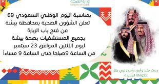 صحيفة عسير – حنيف آل ثعيل : بمناسبة اليوم الوطني السعودي 89 أعلنت الشؤون الصحية بمحافظة بيشة عن فتح باب الزيارة بجميع المستشفيات بصحة بيشة ، اليوم الأثنين الموافق 23 سبتمبر من الساعة التاسعة صباحاً وحتى الساعة التاسعة مساءً ، وذلك لمشاركة المرضى فرحة اليوم الوطني الـ 89.>