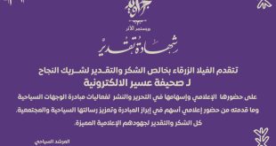 صحيفة عسير – ظافر الشهراني رفع القائمون على مبادرة الفيلا الزرقاء للوجهات السياحية، خالص الشكر والتقدير لصحيفة عسير على دورها الإعلامي المتميز، وما قدمته من جهود في النشر والتغطية الإعلامية التي أسهمت في إبراز أهداف المبادرة ورسالتها المجتمعية والسياحية. وأكد منظم المبادرة المرشد السياحي عبدالله بن حمد الشهراني أن الجهود التي قدمتها صحيفة عسير كان لها الأثر الواضح في …